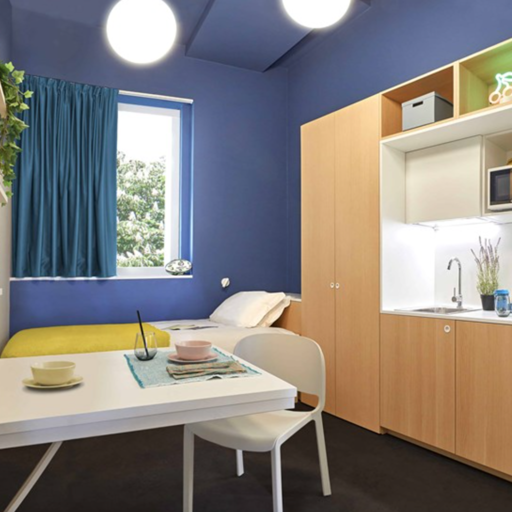 Studenții vor sta într-o reședință universitară nou construită, situată în centrul orașului. Reședința include o sală de sport, săli de film, spații comune și fiecare student va dormi în camere single studio cu baie privată și chicinetă.