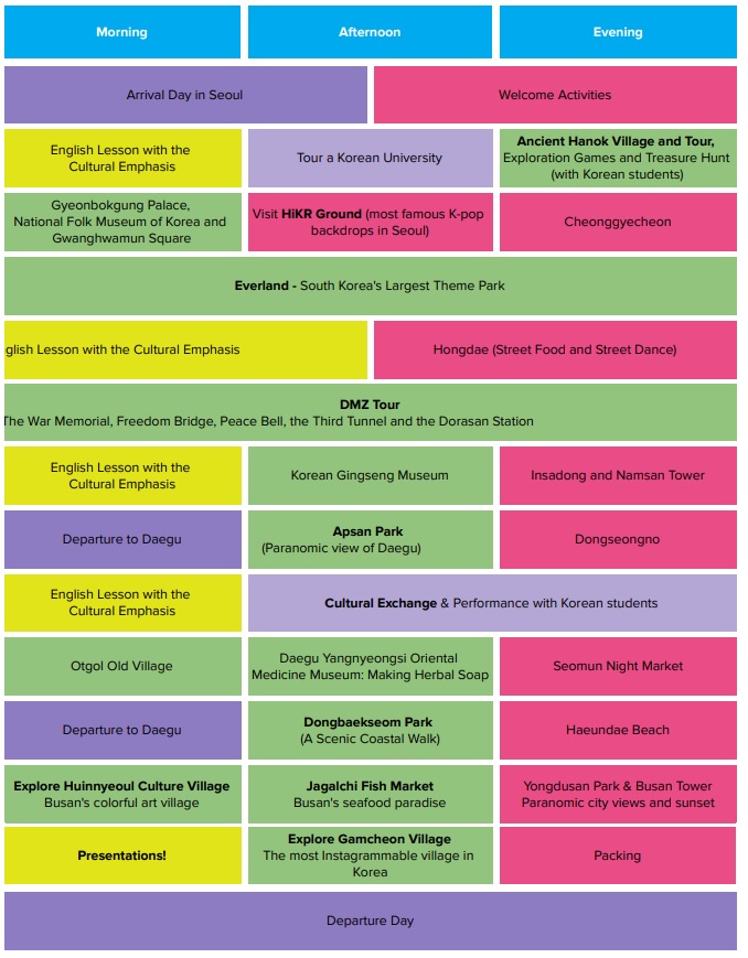 Pe parcursul taberei, pe langa lectiile de limba engleza, elevii vor descoperi unele dintre cele mai fascinante locuri din Coreea de Sud printr-o serie de excursii (exemple):