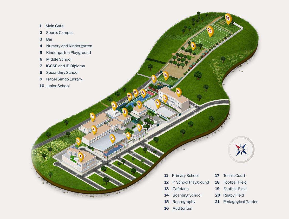 Campusul oferă o zonă de sport de 2.400 m2, cu terenuri de fotbal și rugby, precum și un pavilion polivalent. Aeroportul internațional se află la doar 30 de minute cu mașina de școală.